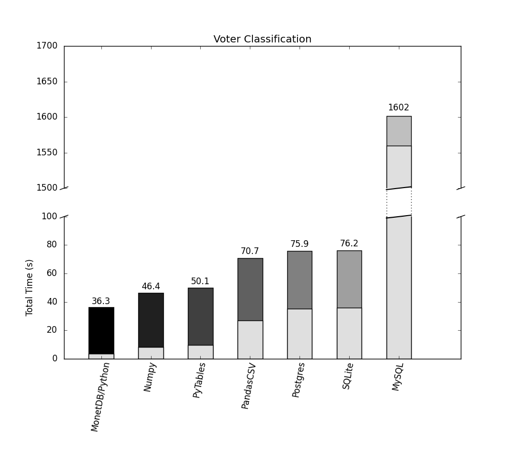 The results of the benchmark are displayed in the above figure. The numbers display the total runtime of the voter classification chain. The gray bars indicate the time spent loading the data into Python.