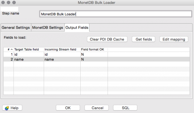 In a PDI transformation you can use the MonetDB Bulk Loader to quickly load your data processed the tool. Do use the bulk-loading component, add it to your transformation, connect it to your stream and configure it to use the pre-configured connection from the Database connection drop down menu. Next, specify in which table the data should be loaded and which fields from the PDI data stream should be written.